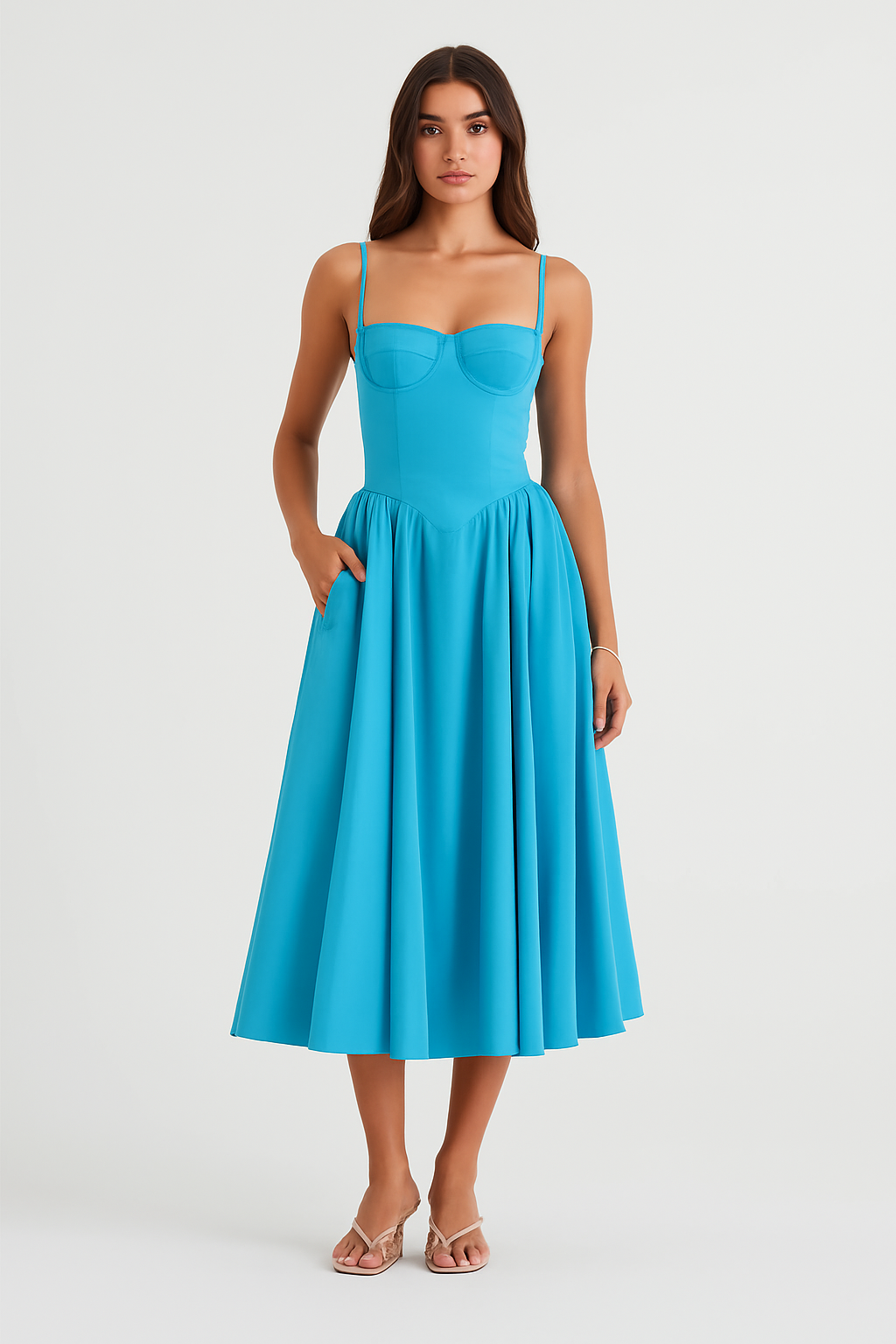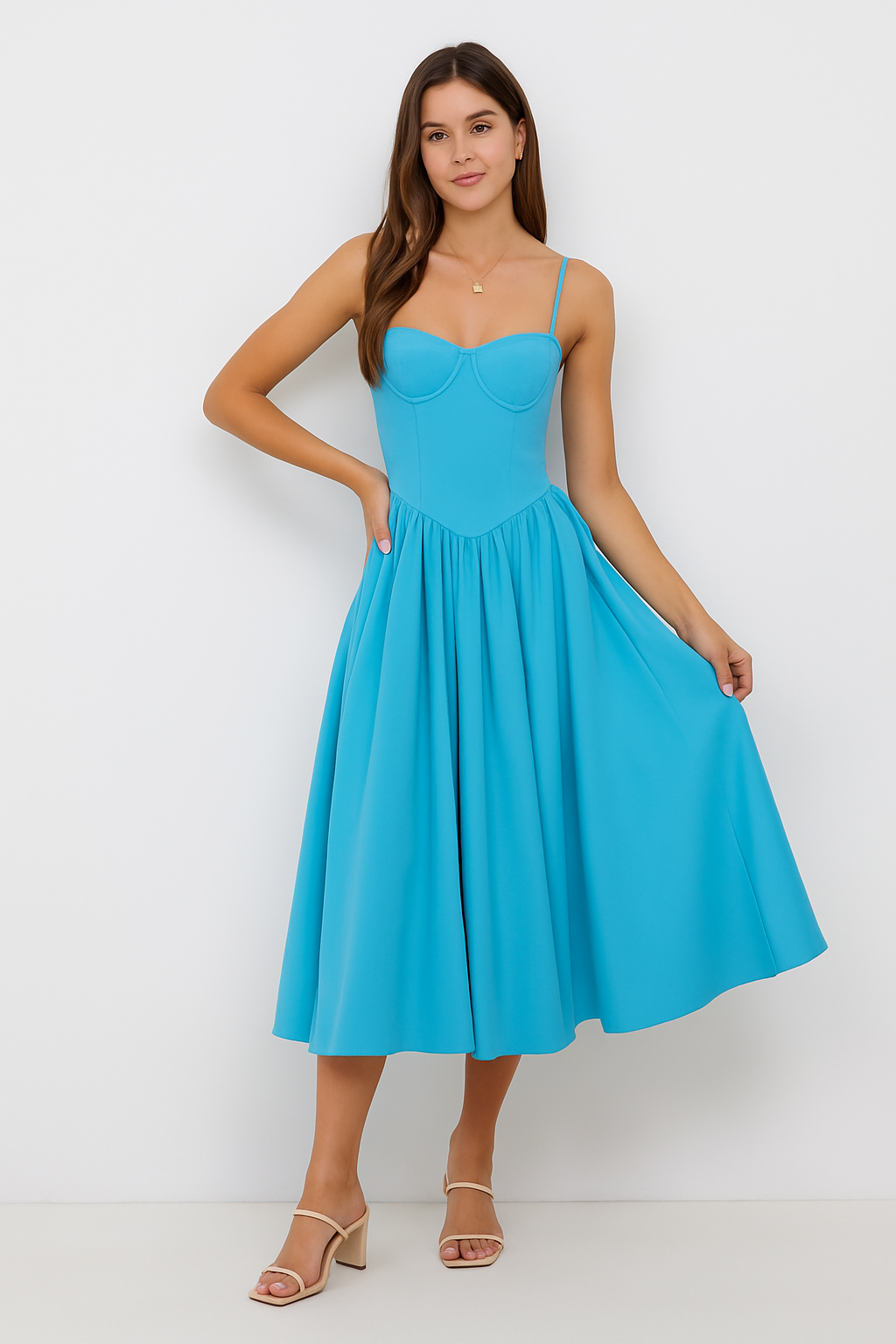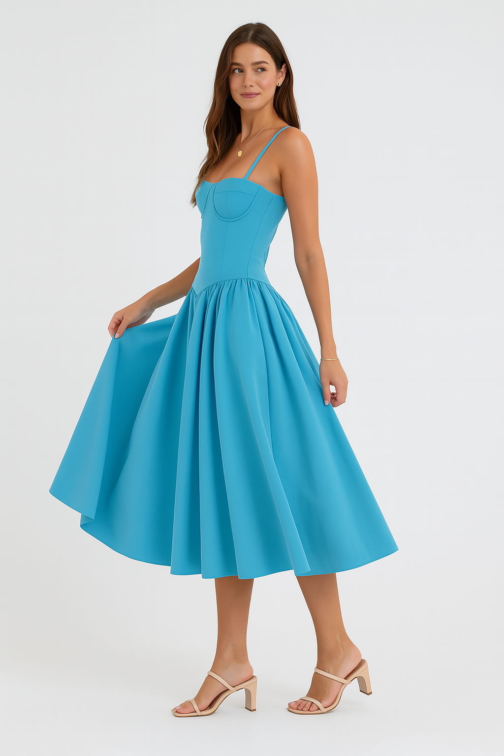 Brisa Celeste es ese equilibrio perfecto entre elegancia y frescura. Su escote estructurado realza con sutileza, mientras su falda amplia y fluida invita al movimiento y la libertad. El tono azul cielo transmite calma y vitalidad al mismo tiempo, como un abrazo suave del viento.