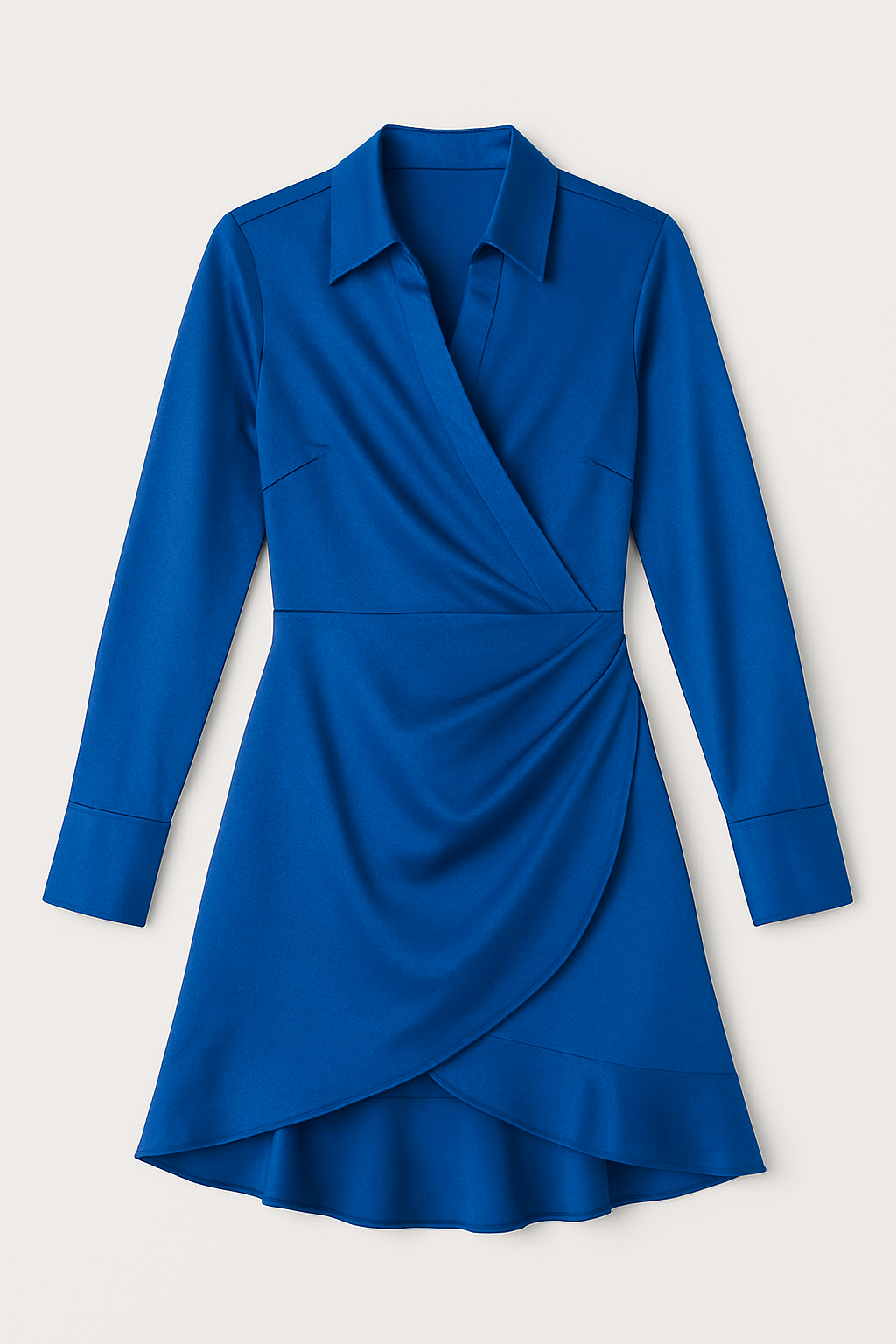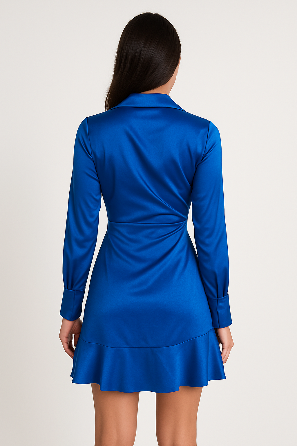 Confeccionado en satén suave, su diseño cruzado en la parte superior se adapta con delicadeza a la silueta, mientras que la falda asimétrica fluye con natural elegancia. Los puños estructurados y el cuello definido añaden carácter a esta prenda que nace para ser el centro de todas las miradas.