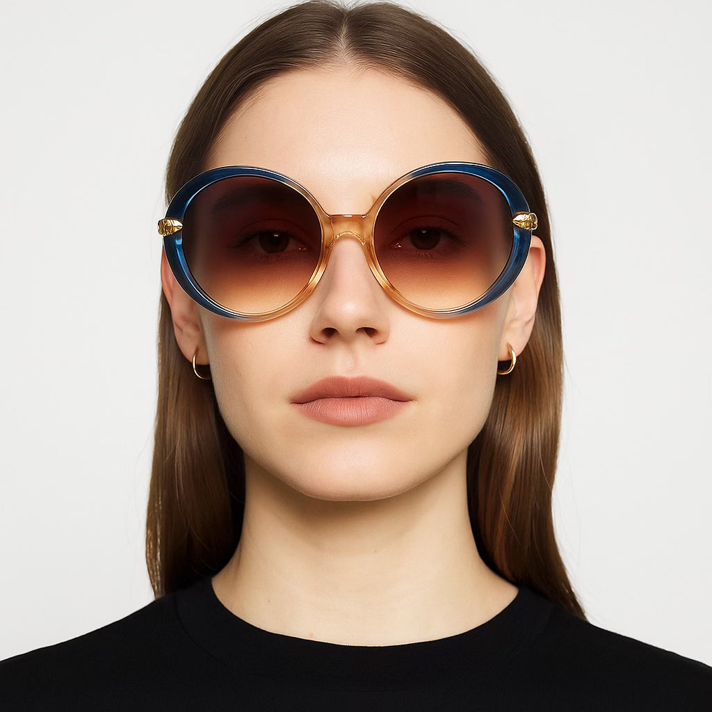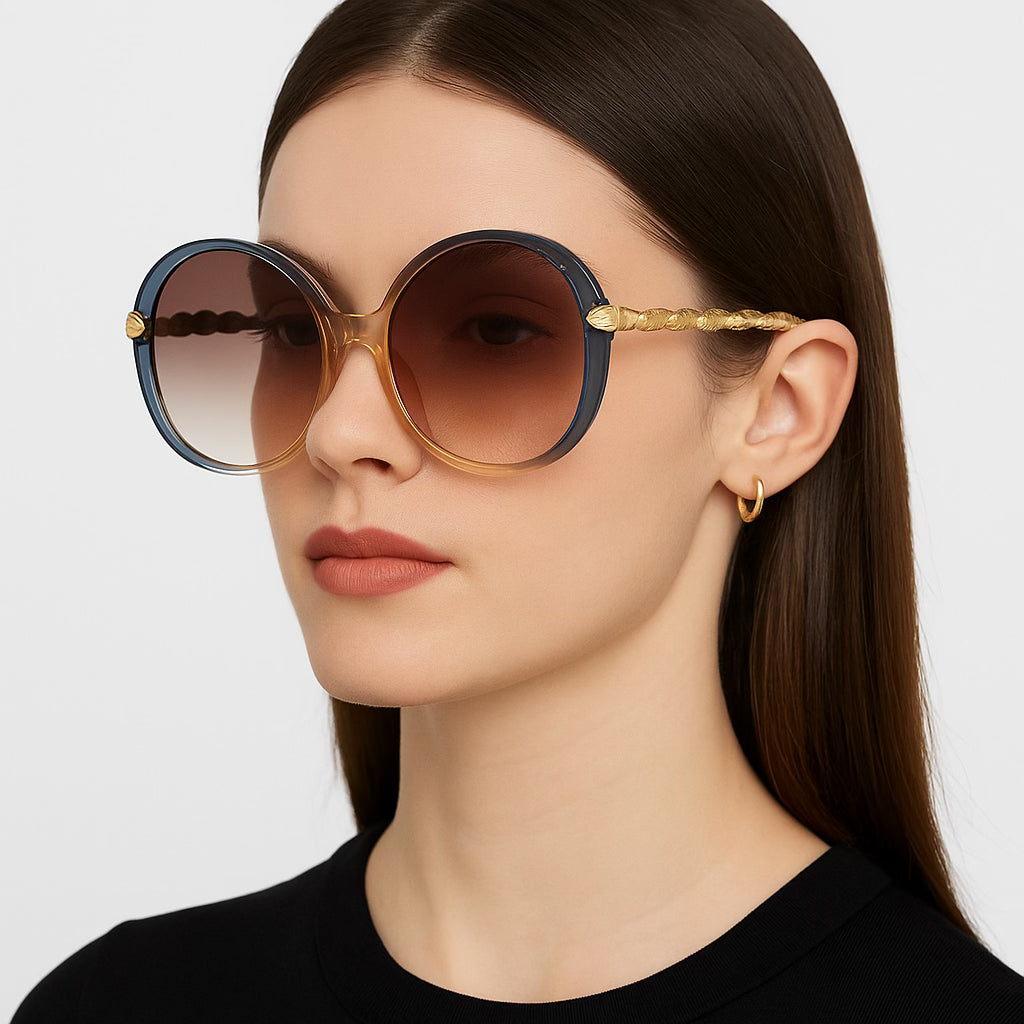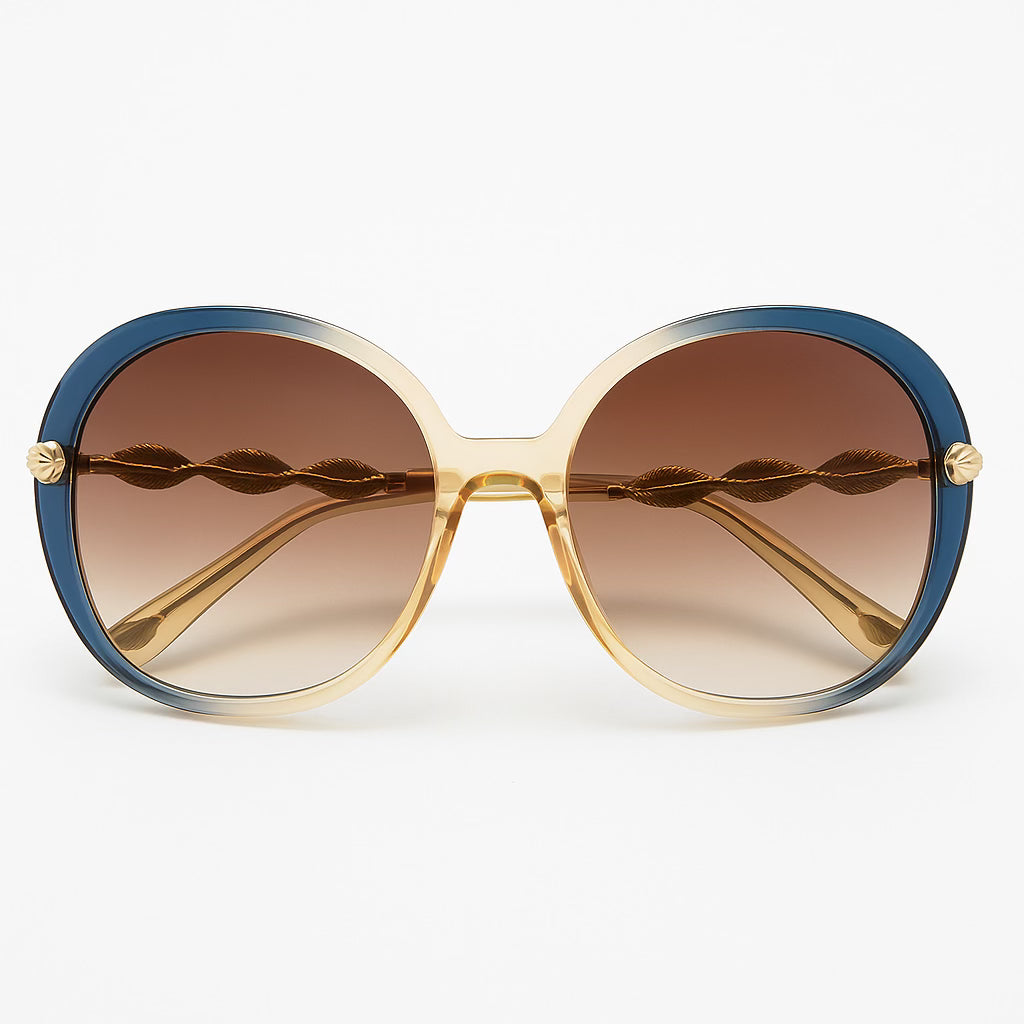 Lentes oversized con montura redonda en degradé ámbar y azul profundo, adornados con detalles dorados en las patillas en forma de hojas entrelazadas que evocan elegancia y distinción. Su diseño no solo protege con estilo, sino que resalta el rostro con un aura luminosa, como una verdadera diosa bajo el sol. Ideales para elevar cualquier look con un toque artístico, femenino y glamuroso.