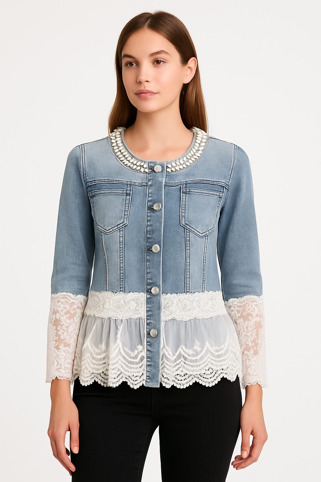 Hecha en denim lavado con acabado vintage (algodón con elastano para mayor comodidad), detalles de perlas en el cuello y ruedo confeccionado en tul bordado de poliéster con terminaciones en encaje. Ligera, estructurada y con mucho carácter.