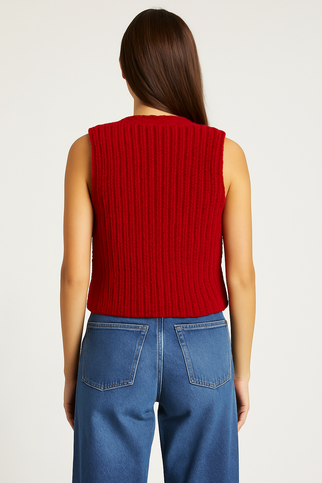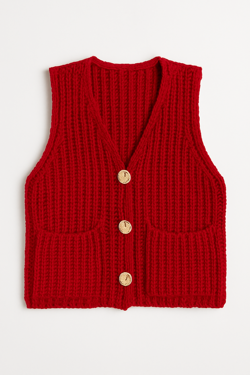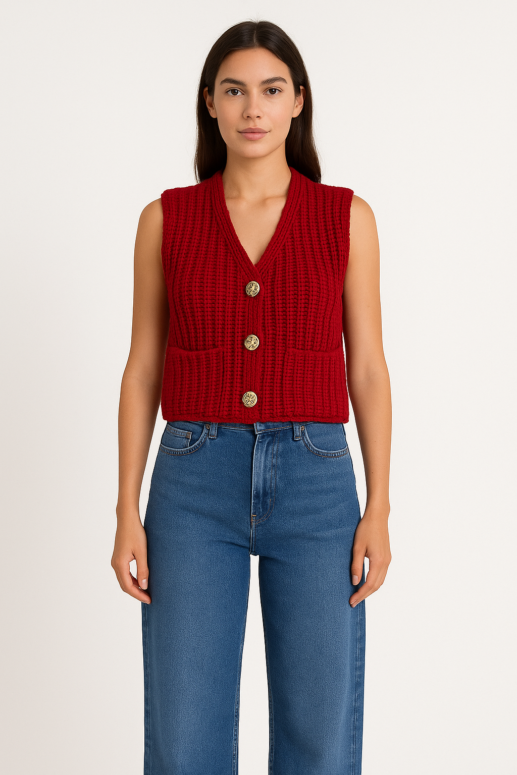 Un tributo al calor del alma, Latido Carmesí es un chaleco tejido a mano que abraza con textura y nostalgia. Su vibrante tono rojo profundo y sus botones metálicos como medallas doradas evocan memorias de hogar, de tardes con olor a café y libertad para ser.