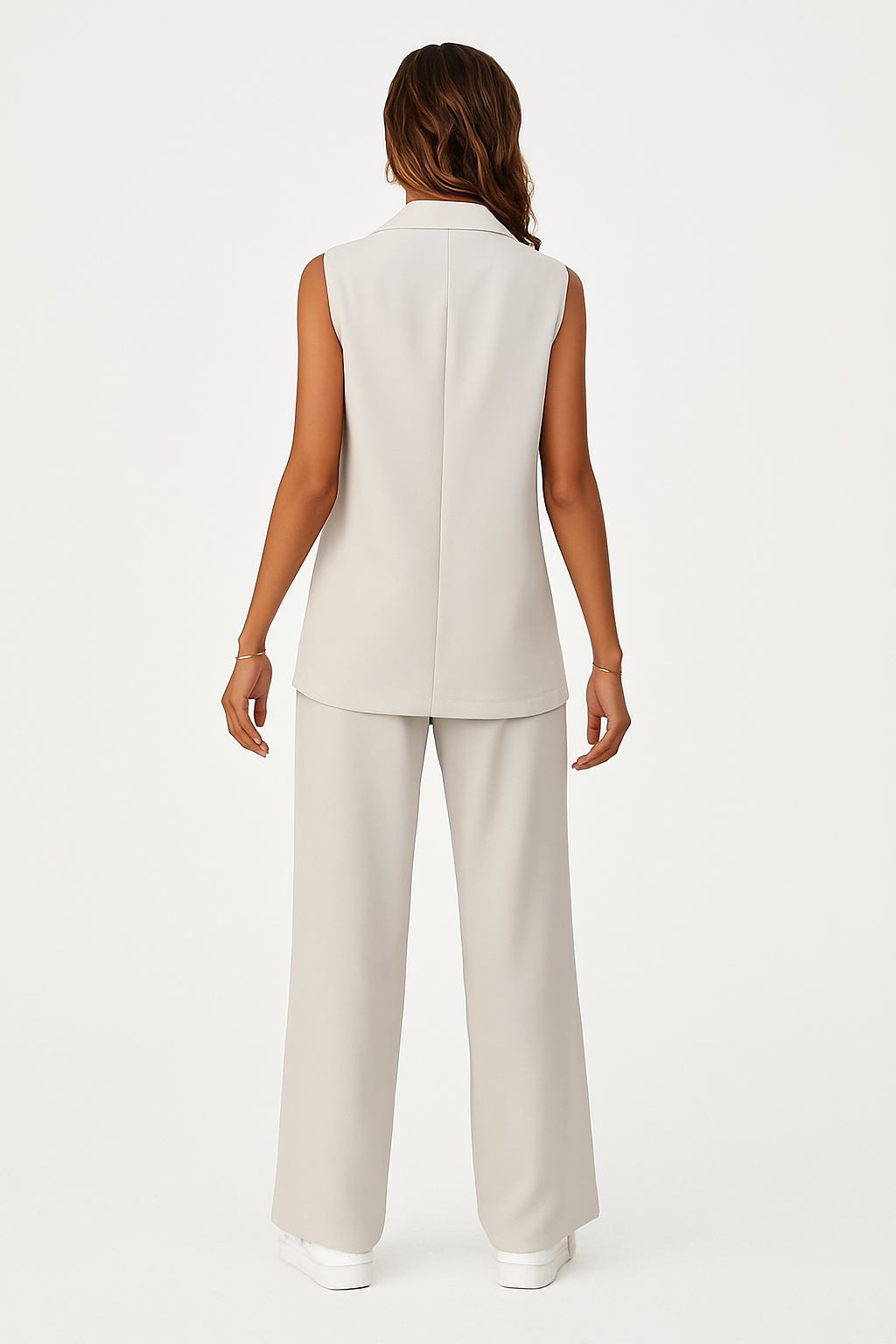 Este set sin mangas en tono crema claro es la definición de elegancia natural. Confeccionado en una tela suave y fluida, el conjunto se compone de un chaleco largo con solapa y pantalón palazzo de caída impecable. Ideal para un look sofisticado sin esfuerzo, ya sea para una reunión importante, una salida casual con estilo o una tarde de inspiración creativa. Combínalo con una cartera minimalista o unos sneakers blancos y deja que tu luz interior hable por ti.