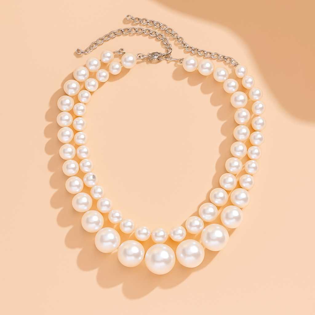 Un collar doble de perlas blancas que evoca elegancia clásica con un giro contemporáneo. Su diseño en capas —una fila con perlas medianas y otra con perlas de gran tamaño— logra un equilibrio perfecto entre sofisticación y poder femenino. Ideal para elevar cualquier look, desde una camisa blanca hasta un vestido de noche. Una pieza atemporal que honra la esencia de una mujer que se siente segura de su luz interior.