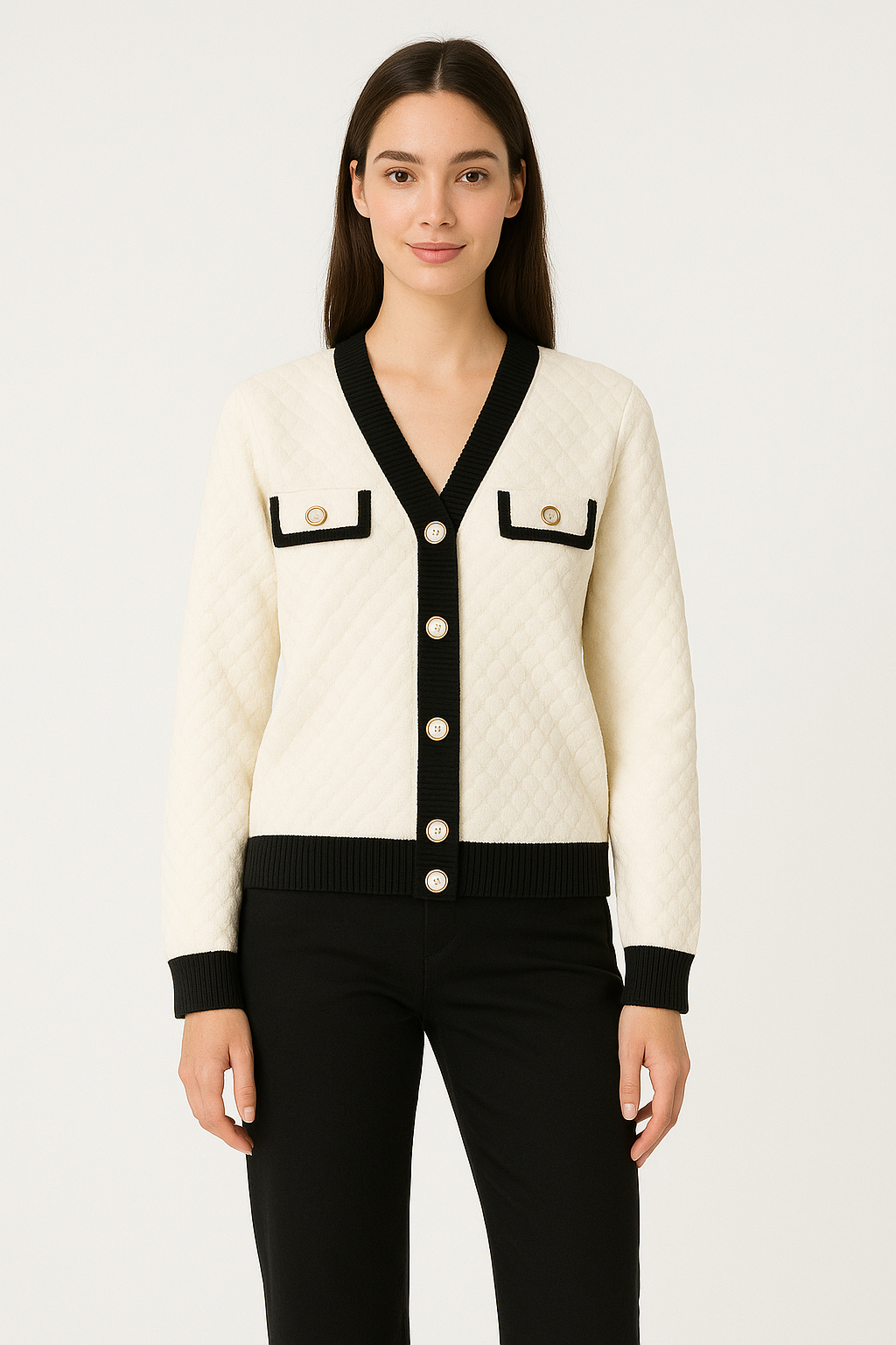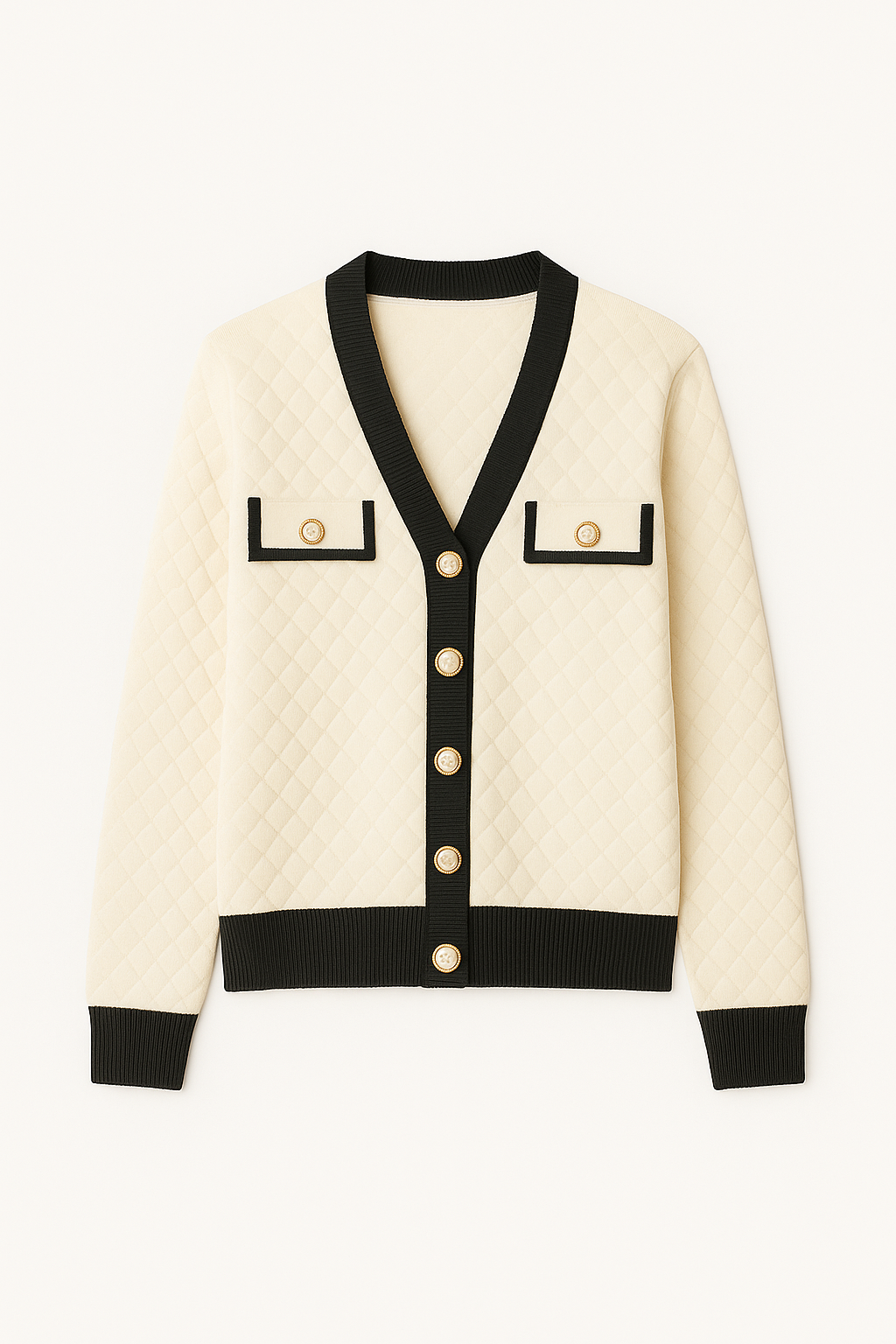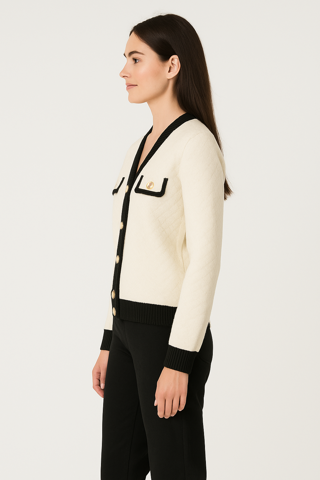 Diseñado para abrazarte con calma, el cardigan Serenidad reflejala belleza de lo simple y lo auténtico. Confeccionado en un tejido suave de textura acolchada, su contraste en negro aporta equilibrio y carácter, mientras que los botones dorados evocan pequeños destellos de luz en los días más neutros.