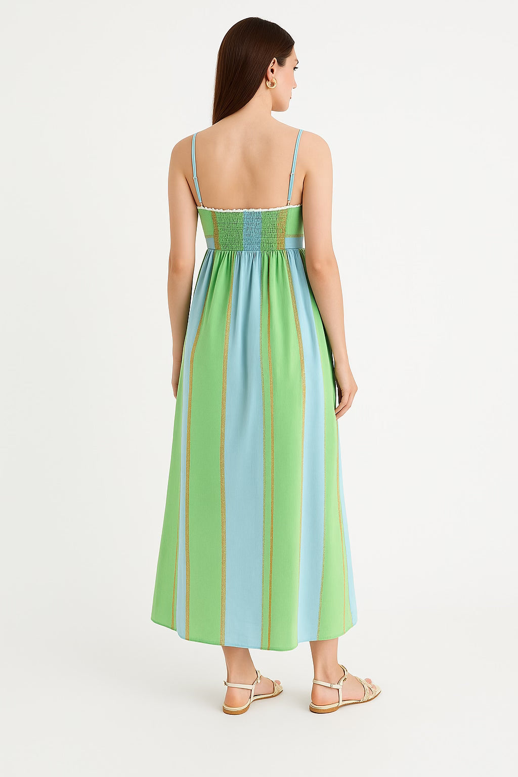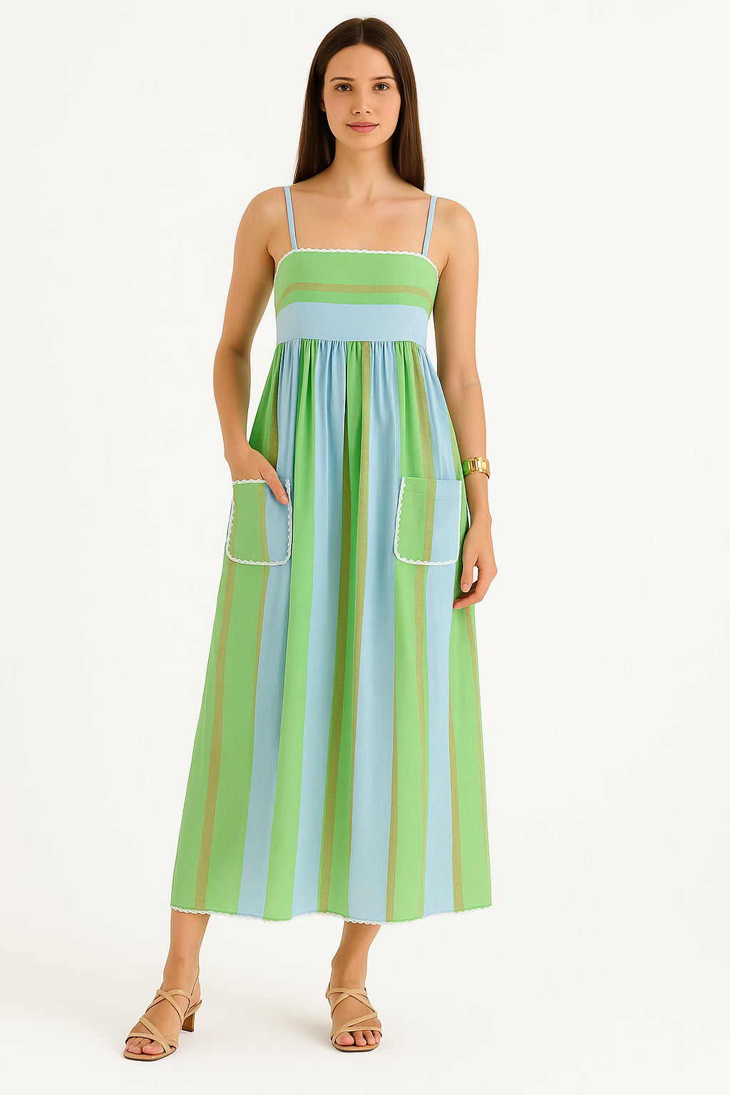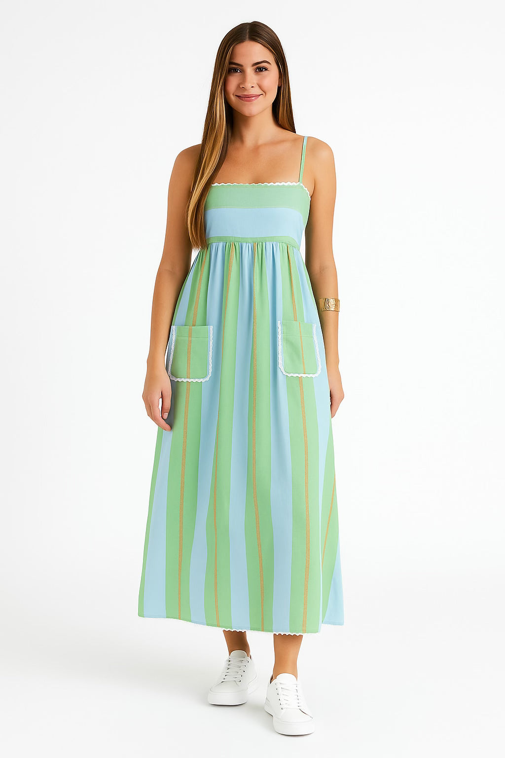 Un vestido largo con alma de siesta bajo el sol. Ternura Tropical es fluido, colorido y cómodo, perfecto para esos días donde lo único urgente es disfrutar. Sus tonos verde limón y azul cielo se funden en rayas verticales que alargan la silueta, mientras que los bolsillos frontales con detalle de encaje blanco le dan ese toque artesanal y femenino. Para las que viven con ligereza, pero no con prisa.